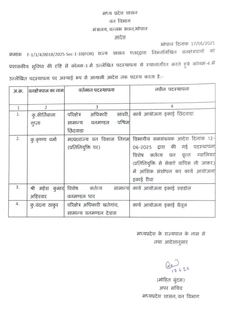 जिले की दो महिला रेंजर सालों से एक ही रेंज में पदस्थ है और वन विभाग के अधिकारियों का उन्हें पूरा सहयोग और संरक्षण मिल रहा है। परासिया रेंज की रेंजर अलका भूरिया सन 2017-18 से परासिया रेंज में पदस्थ है उन्हें वहां लगभग 8 साल हो चुके हैं। इस बीच एक बार उनका तबादला कार्य आयोजना शाखा छिंदवाड़ा में किया गया। इस दौरान भी हल्का भूरिया परासिया रेंज के प्रभार में रही। यानी उनकी पदस्थापना तो कार्य आयोजना शाखा में दिखाई गई लेकिन रेंज से उनका नाता नहीं टूटा। या यूं कहे की काम वे परासिया में ही करती रही।