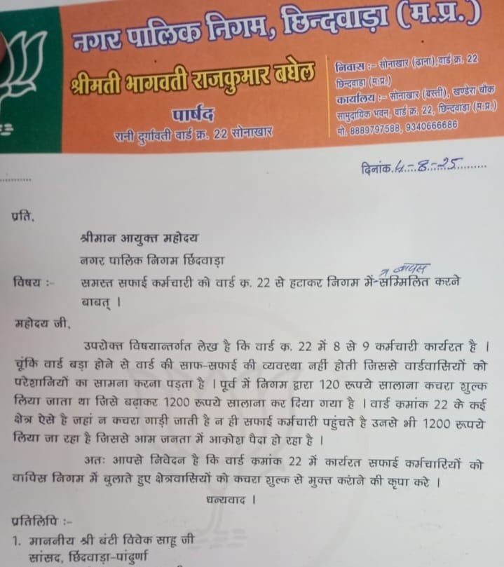 नगरनिगम का बढ़ाया हुआ टैक्स इतना ज्यादा है कि अब भाजपा पार्षद ही इस बात का विरोध जताने सड़कों पर उतरने लगे हैं। दरअसल यह मामला तब प्रकाश में आया जब वार्ड क्रमांक 22 रानी दुर्गावती वार्ड की पार्षद श्रीमती भगवती राजकुमार बघेल ने अपने लेटर हेड में लिखकर महापौर विक्रम आहके और नगर निगम कमिश्नर सीपी राय को एक आवेदन दिया । उसमें कहा कि उनके वार्ड में 7- 8 सफाई कर्मी तैनात है। लेकिन वार्ड बहुत बड़ा होने के कारण सफाई कहीं नजर नहीं आती और ना ही सफाई कर्मी पूरे वार्ड में सफाई कर पाते हैं । इससे बेहतर होगा कि इन सफाई कर्मियों को वापस नगर निगम बुला लिया जाए । इसके अलावा उनके वार्ड वासी भी नगर निगम का बढ़ाया हुआ 1200 रुपए सालाना सफाई टैक्स नहीं दे पाएंगे । पार्षद ने साफ शब्दों में लिखकर अपना आवेदन नगर निगम तक पहुंचा दिया है।