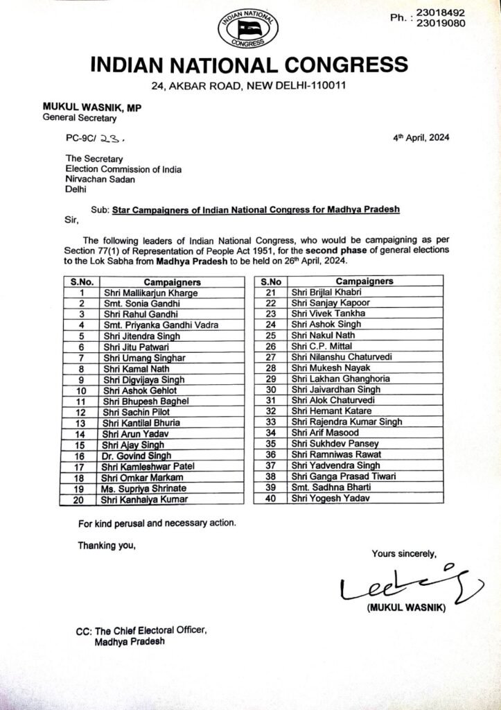मतदान के दूसरे चरण के लिए इंडियन नेशनल कांग्रेस ने जारी की स्टार प्रचारकों की सूची